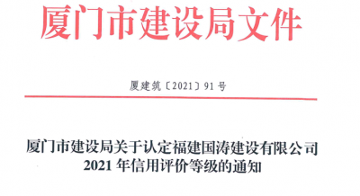 各有关单位: 根据企业申请,福建忠科建设有限公司成立全资子公司福建国涛建设有限公司,并将忠科公司的部分主要技术人员、机械设备、以及建筑工程总承包一级资质转移至子公司经营,经研究,同意认定福建国涛建设有限公司信用评价等级为BB+,同时撤销福...