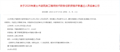 2020年度土木建筑类工程师评审会于2021年11月26-11月28日召开,现将通过人员名单予以公示。最终评审通过人员名单以批准确认文件为准。 如有异议,欢迎在公示期间以来电、来信的形式实名反映对公示对象的意见,并提供联系方式,我们将...